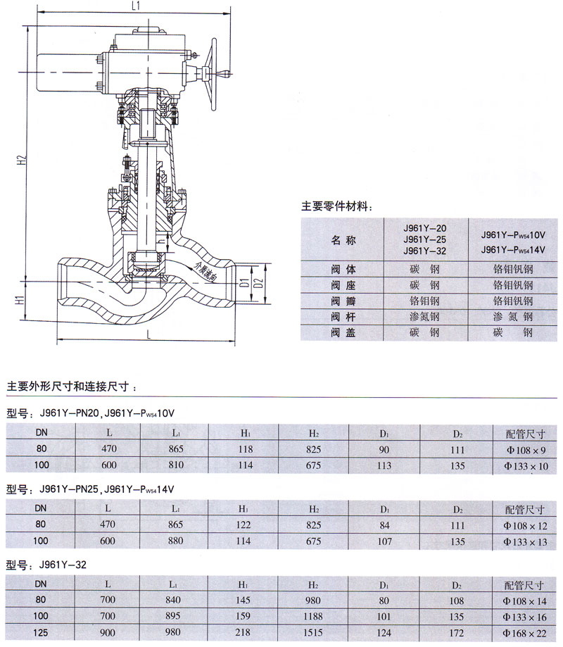 一、用途: 安装在水、汽管道上、作为启、闭装置用。 二、结构特点: 1、阀门口径DN50以下的阀体、阀盖是模锻件、DN65以上的阀体、阀盖是铸钢件。 2、阀体与阀盖的连接形式各有不同、DN10-DN50是夹箍销轴式连接;DN65以上采用中法兰垫片连接和自密封螺纹连接。 3、阀座、阀瓣密封面均采用等离子喷焊或堆焊钴铬钨硬质合金,密封面硬度高、耐磨、抗擦伤、使用寿命长。 4、阀杆材料为渗氮钢、渗氮后的阀杆表面硬度高、耐磨、抗擦伤、同时防腐蚀、使用寿命长。 三、注意事项: 1、安装阀门时注意介质的流向,严格按阀门流向箭头指示的方向安装。 2、阀门可安装的管道的任何位置、同时根据介质和介质的温度选择碳钢或合金钢的阀门。 3、电动截止阀尽量垂直安装,阀杆向上。 |